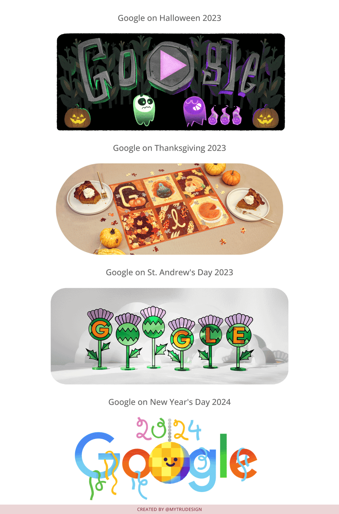 Holidays aren’t the same for everyone! Consider your audience and the diverse holidays they celebrate. By widening your color palette to include shades tied to various cultural festivities—such as the spooky aesthetics of Halloween, the warm orange tones of Thanksgiving, the green tones used to illustrate a handcrafted stained glass window for St. Andrew's Day, or New Year’s golds and silvers—you can appeal to a broader audience while being mindful of inclusivity. One of the best examples for this case is Google.