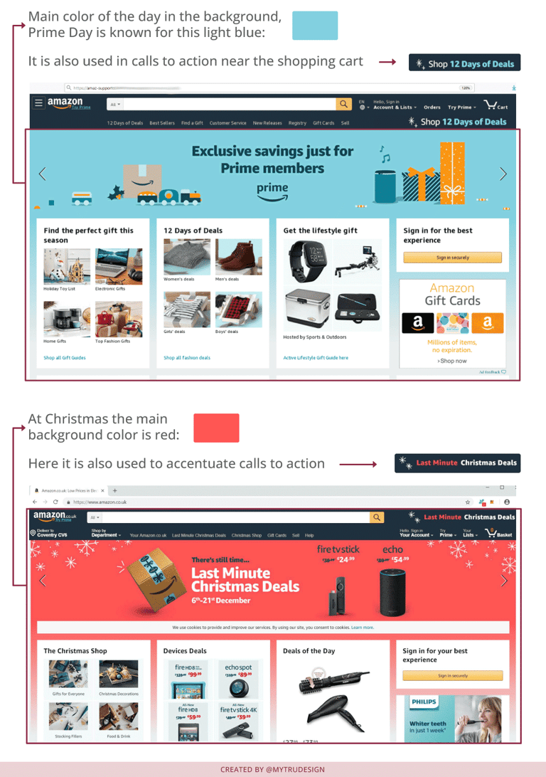 For example, Amazon strategically integrates holiday colors into its marketing materials, particularly for call-to-action buttons and promotions. During events like Black Friday, Prime Day, or Christmas, they might transform their standard orange “Add to Cart” buttons into festive red or green to capture attention. Additionally, red or blue accents often feature in banners that highlight special holiday deals. This method makes promotional content stand out while maintaining a consistent layout and branding across their site.