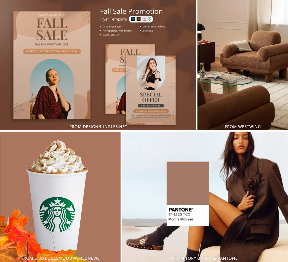 How about a seasonal campaign? Incorporate Mocha Mousse into your holiday or seasonal materials to give your brand a fresh look, all while staying true to your core colors. If you're launching a new product in the fall, this shade would be a perfect fit for the season. Here you can see some examples: