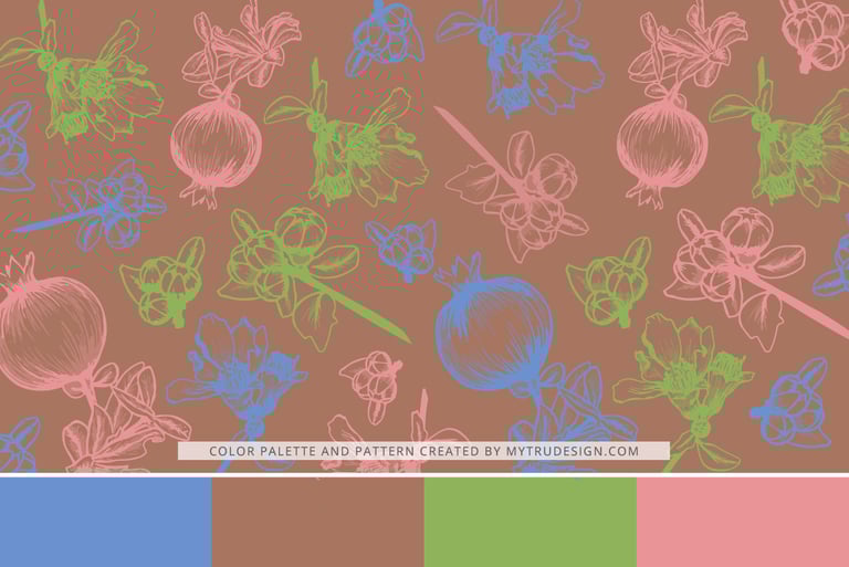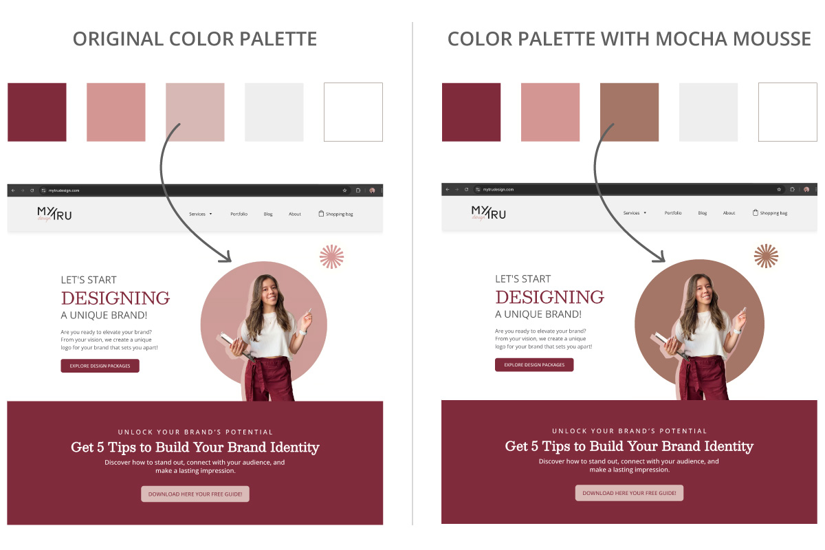 As a complementary color in your palette. I’ve previously emphasized the importance of maintaining a consistent color palette to strengthen your brand identity, and that's still true. However, if you have similar hues within your established color palette, you can introduce Mocha Mousse as a complementary accent to add depth and visual interest. For example, on the left, you will see the original colors of my brand, and on the right, I replaced one of my colors with Mocha Mousse.